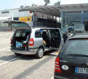 Évora PortugalBye-Bye Rental Carby Ranger Kidwell-RossOn our way to the next story location I managed to, single-handedly, blow up the electronics in our rental car -- a nice, peppy 6-speed Mercedes wagon that when I'd picked it up had gone only 2,000 km. All I did, quite innocently enough, was go swimming with the car's electronic key in my pocket. Apparently, something about its tiny circuit board was allergic to salt water. After my swim, I discovered the key was completely dead. Attempting to remedy the situation, I took the key apart (using the illustrations in the German-language owners' manual as a guide) and dried it out for several hours on the car's dashboard in the sun. Still, nothing. It appeared as though we'd be stranded in a small town square on the southern border of Spain for, perhaps, the entire weekend. I was soon hit with an inspiration for a faster way to dry the key. I noticed a child playing in a fenced-in yard and hoped he could help. I knew enough Spanish words that I was able to make him understand I wanted him to ask his parents to come talk to me. Then, truly stretching both my use of Spanish and his mom's credulity, I managed to convey that I wanted her to dry my key by using her electric hair dryer set on the 'frio,' cold, setting. Unfortunately, she apparently understood everything except the part about using the cool setting. When she brought the key back across the yard, it was still very hot to the touch. With little hope, I put it into the ignition. The result was like one of those good news/bad news jokes. Although, happily, the key then started the engine, significant portions of the car's electrical system had become inoperable. This included the ability to activate either the driver or passenger windows, both of which were rolled all the way down. Although annoying, that 'minor' inconvenience paled in comparison with the fact that the headlights were stuck on the high-beam setting and the taillights and brake lights were permanently illuminated. I rationalized we really didn't really need the speedometer or any of the other non-working gauges that were also now defunct. Since we were in a very small beach town, and nightfall was quickly approaching, we decided to drive toward the nearest Avis location. This turned out to be in Porto, Portugal, located 90 kilometers to the south. It was a wild ride, featuring a number of other drivers honking, flashing their lights and/or 'waving' at us along the way. Fortunately, it was a warm, clear, full-moon night and, best of all, the car stereo still worked fine! And, given the car's license plates (since I'd rented the car in Hamburg) everyone would have thought we were Germans... Porto came into view just before midnight.