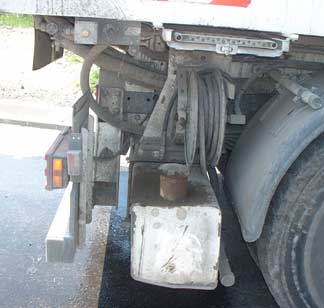 However, looking closer at the rest of the machine, it was apparent that overall maintenance care was lacking. The tops of the tanks, around both fuel tank fillers, were coated with a thick layer of 'petroleum dirt.' The general appearance of the sweeper made me wonder if pressure washers were available in this country, yet, there was (what appeared to be) a high-pressure hose located right on the back of the sweeper. One of the large, air transfer hoses had been patched in two places, using foot long pieces of rubber. Their edges were lined with grommet holes, and were secured together with heavy plastic ties, then applied over the holes in what appeared to be a 10-inch intake or exhaust hose. Although these no doubt helped considerably, in all likelihood, the air continued to leak under the patches.