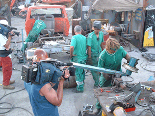 At this point it was well into mid-afternoon, and it didn't seem possible either team could come up with a working machine in the allotted timeframe. By now, the heat was getting truly oppressive, even for those of us who were standing around in shorts. For the team members, outfitted in their fireproof coveralls and working frantically, it had to be stifling.